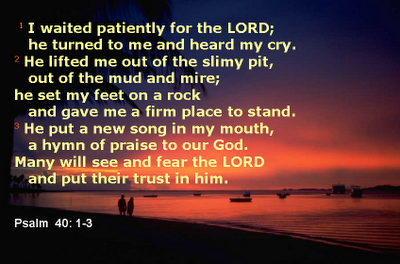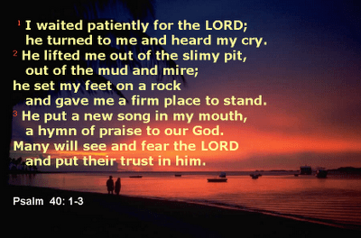 I waited patiently for the Lord; he turned to me and heard my cry. He lifted me out of the slimy pit, out of the mud and mire; he set my feet on a rock and gave me a firm place to stand. He put a new song in my mouth, a hymm of praise to our God. Many will see and fear and put their trust in the Lord.